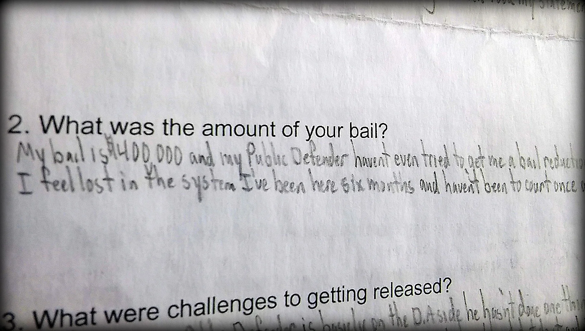 CALVIN: My bail is $400,000 and my public defender hasn’t even tried to get me a bail reduction so I’m just stuck sitting here. I feel lost in the system. I’ve been here six months and haven’t been to court once and I still don’t know anything about my case!