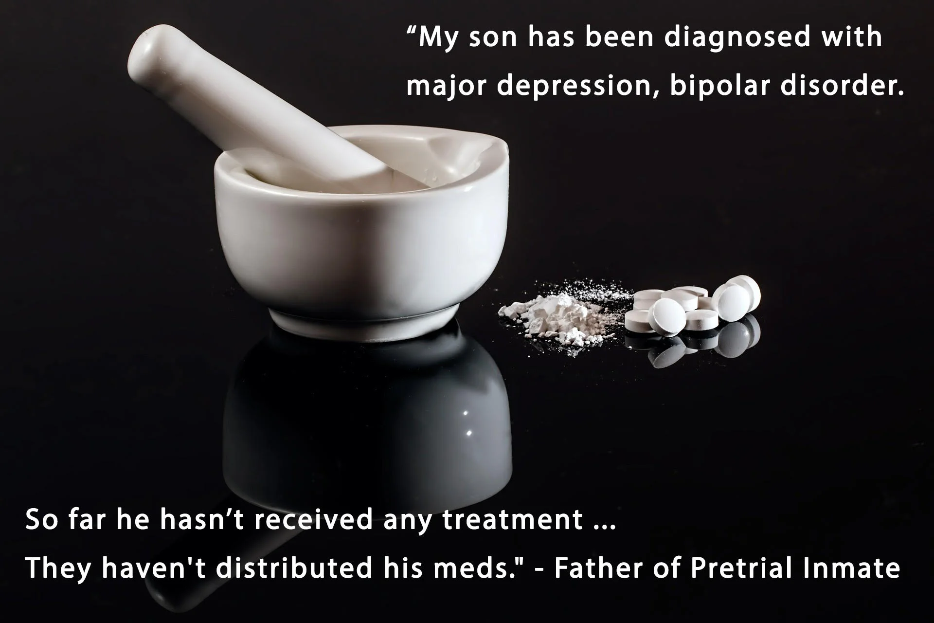 My son has been diagnosed with major depression and bipolar disorder. He has been held in pretrial for almost four months. So far he hasn’t received any treatment. I asked his doctor to put him back on medication, but they said that they won’t work if they’re on medication because it makes them sleepy. He never heard back and they haven’t distributed his meds.