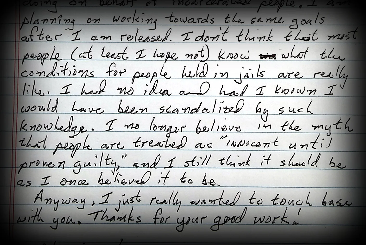 As to my mindset, well, jail has changed my outlook about a lot of things. I no longer believe in the myth of “innocent until proven guilty” for starters. I was, as an empirical scientist performing cutting edge research, a devout atheist. In my time here I have found that God is real, and have become a follower of Christ. I do not think that I could have survived here this long without God’s help.